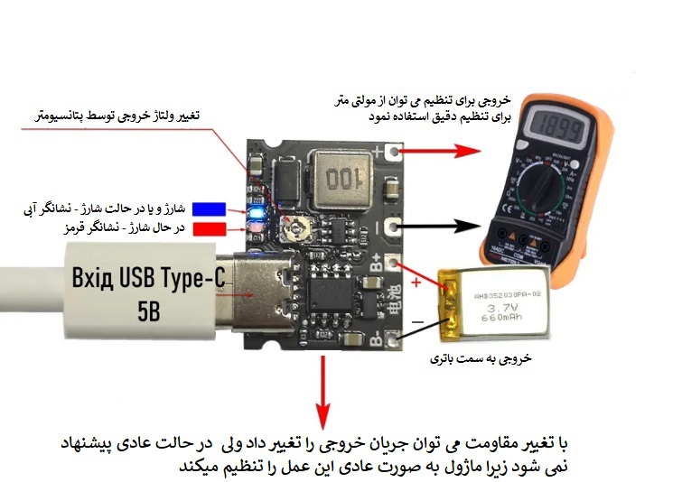 با این ماژول می توانید به راحتی باتری های لیتیومی را شارژ کنید. این ماژول با دارا بودن ورودی USB Type-Cمی تواند تغذیه خود را تامین می کند و همچنین می توانید از پین های کناری سوکت جهت اعمال ولتاژ شارژ بر روی باتری استفاده کنید. این شارژر دارای دو نشانگر LED درحال شارژ(LED قرمز) و نشانگر شارژ کامل(LED آبی) میباشد. علاوه بر آن با دارا بودن پتانسیومتر بر روی ماژول امکان تغییر ولتاژ خروجی نیز میسر می باشد .
